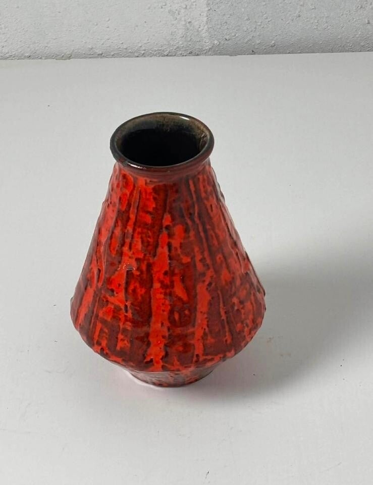 Splendido vaso artistico in ceramica della Germania Ovest, pezzo iconico del design Mid-Century Modern. Caratterizzato dalla celebre smaltatura "Fat Lava" con texture a rilievo e un vibrante contrasto cromatico rosso corallo e nero